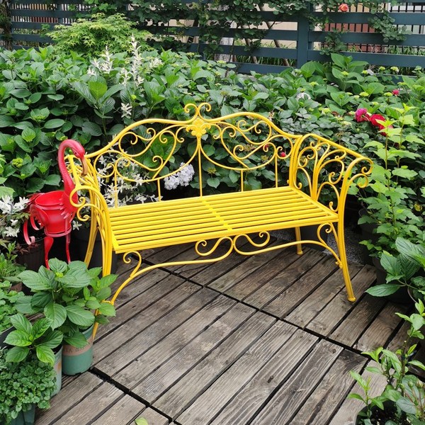 11번: 야외 정원 베란다 의자 스몰 빈티지 엔틱 2인용 철제 벤치, 옐로우