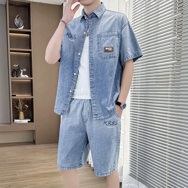 22번: 남성 캐주얼 데님 반팔 반바지 투피스 데일리 여름 데님 청 반팔셔츠 상하 세트