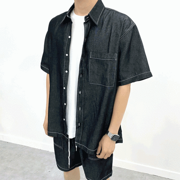 10번: 남자 스티치 데님 청 반팔셔츠 반바지 셋업 세트