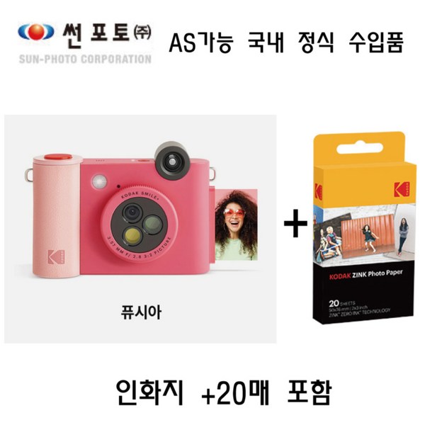 16번: 신형상품) 국내 정식 수입품 색상(퓨시아)코닥 스마일 [플러스] (필름 기본5장+20장추가 총25매증정) Kodak Smile + 디지털 즉석 카메라 & 포토 프린터, 1개, 코닥플러스필름기본5매+필름20매