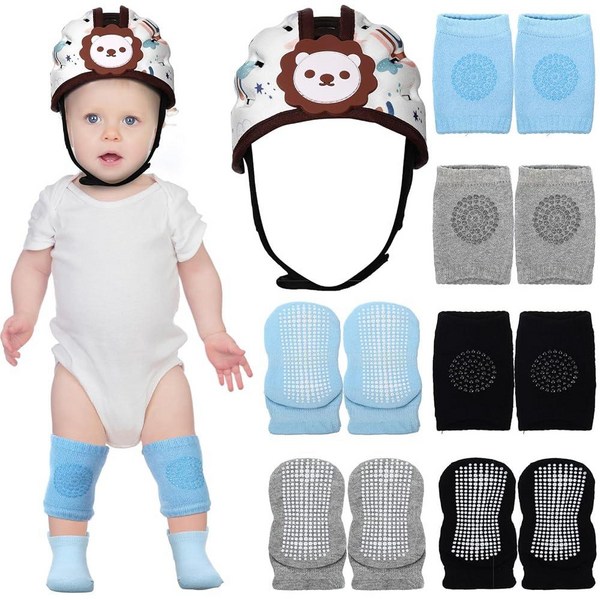 16번: JaGely 아기 안전 헬멧 브라운 라이온 조절 가능한 아기 머리 보호대 통기성 안전 헤드 쿠션 3쌍 아기 미끄럼 방지 발목 양말 3쌍 미끄럼 방지 무릎 패드 1-3세 유아 산책용