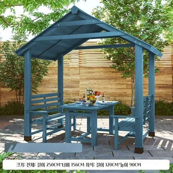 16번: 야외 정자 원두막 테라스 부식 방지 목재 지붕 전원생활 안뜰 나무 안뜰 정원 파고라, 250x145cm 테이블+의자 (블루)
