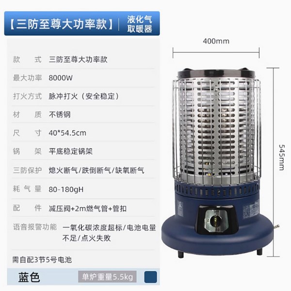21번: DEALERS 난방 무동력 캠핑벽난로 에코 캠핑 난로 용품 TEF무동력팬 검정색 화목 EF705B, 블루LPG모델 8000K 고출력난로 송압밸브+2M관, 1개