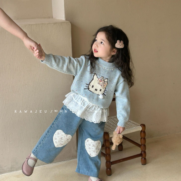 19번: 하와즈 여아 봄 가을 겨울 귀여운 자수 야옹이 니트