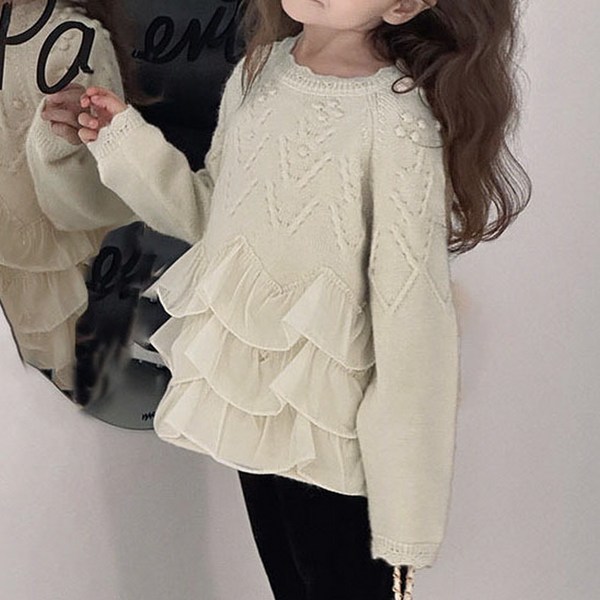 1번: 리율링 키즈 여아 프릴 스웨터 긴팔 라운드넥 니트 티셔츠 레이스 아동 겨울 상의