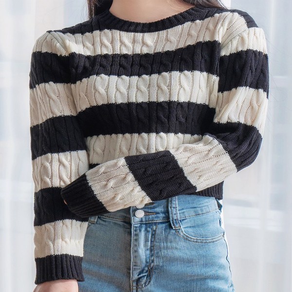 27번: 메이징키즈 주니어 여아 봄 가을 루즈핏 스트라이프 꽈배기 니트