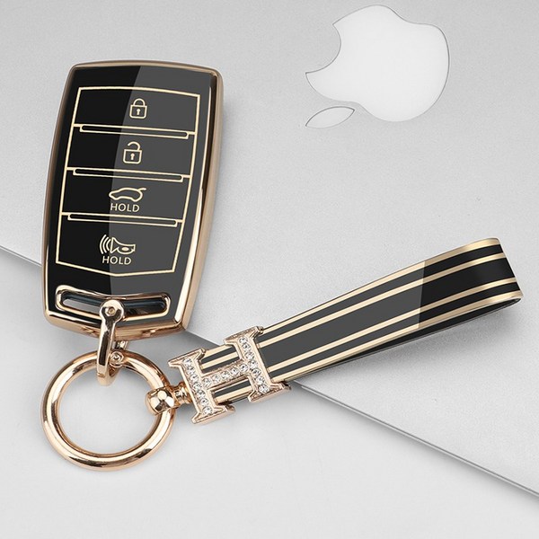 25번: 키에티 제네시스 G70 G80 G90 EQ900 4버튼 키케이스 + H큐빅 키체인, 골드-블랙