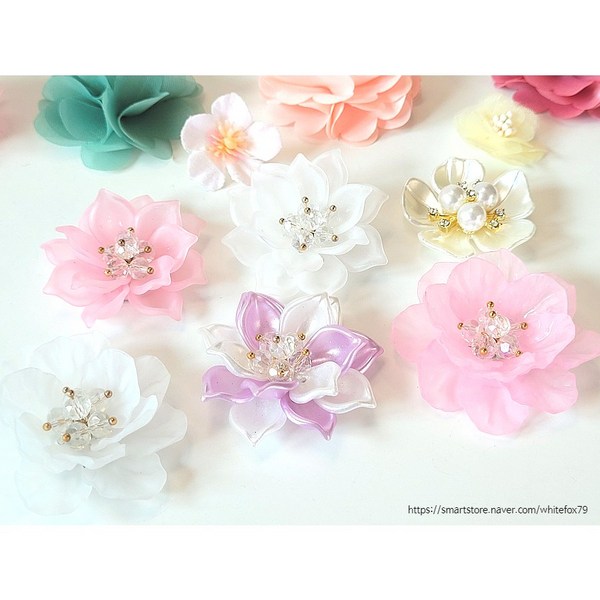 29번: 여우스토리 자개st 비즈모티브 배씨자개장식 비녀장식 뒷꽂이장식 리본공예재료 배씨재료 배씨장식 명절선물포장재료 용돈봉투장식 하양여우, 겹꽃잎 핑크, 10개