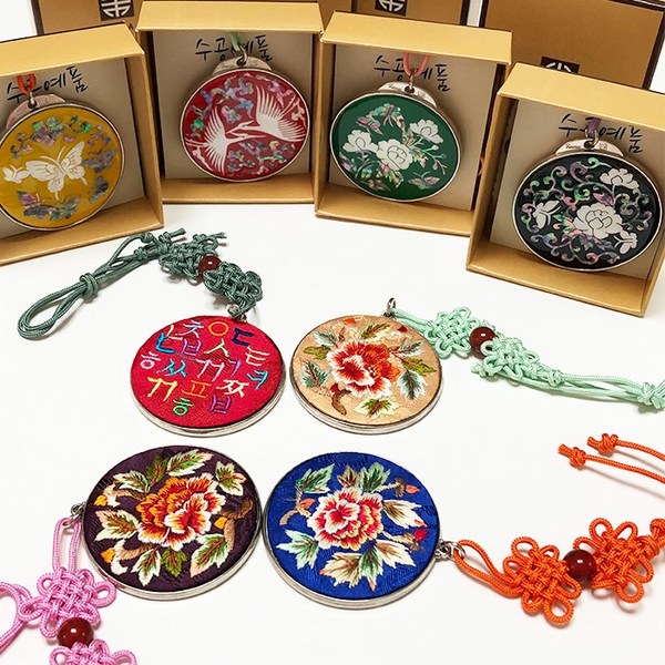 9번: 매화당아씨 전통 자개꽃자수 휴대용손거울 전통공예품 자개손거울 외국인선물기념품, 꽃자수셋트
