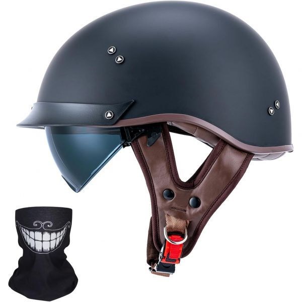 26번: 하프 모터사이클 헬멧 오픈 페이스 선바이저 퀵 릴리스 버클 DOT 승인 성인 남성 여성용 크루저 파일럿, Matte Black, Large