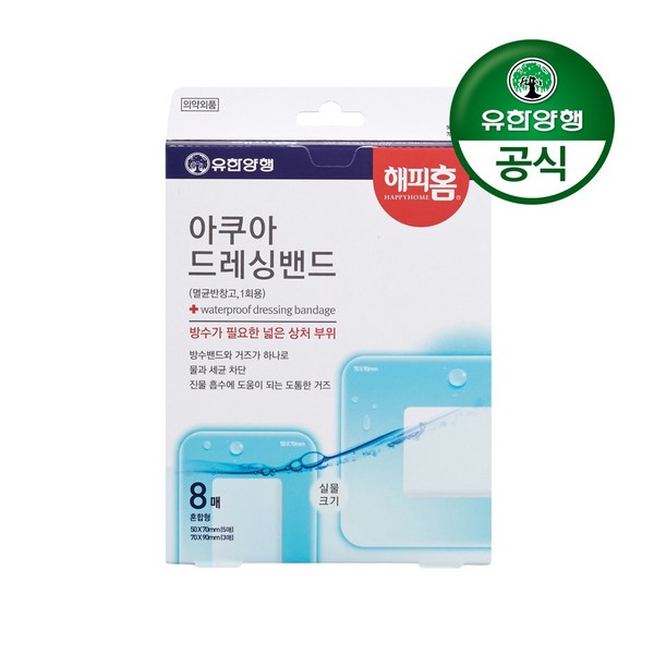 16번: 유한양행 [본사직영] 해피홈 메디큐어 아쿠아 드레싱 멸균밴드(혼합형) 8매입, 1개