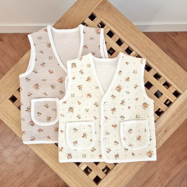 28번: 국내생산 유아 누빔 수면조끼 반조끼 숏 잔잔 꽃무늬 내츄럴 컬러