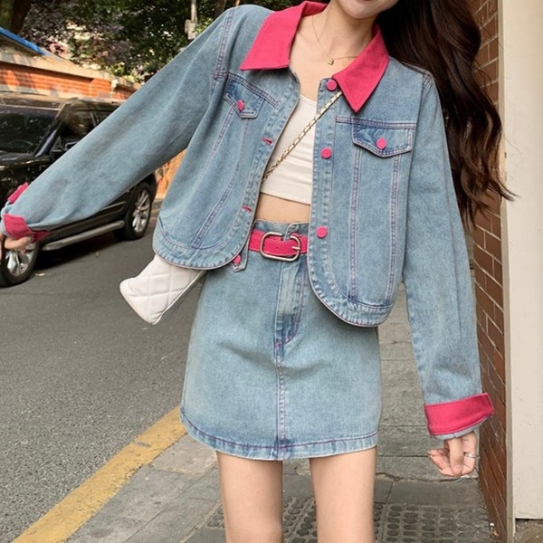 29번: 큐티유 여성 배색 데님자켓+스커트+벨트 세트