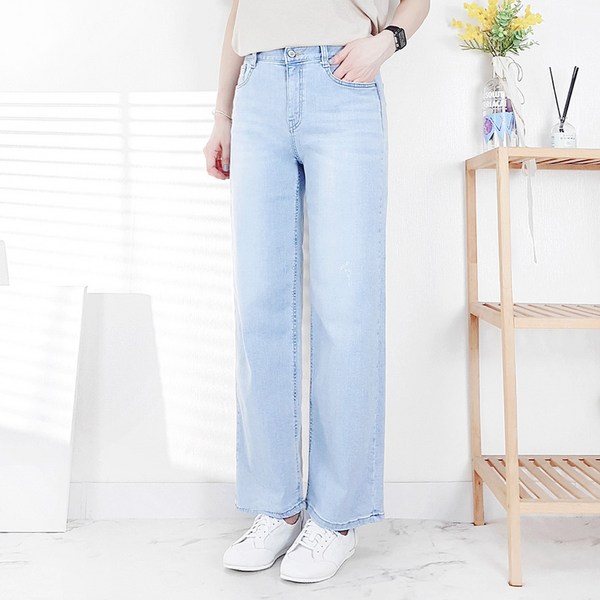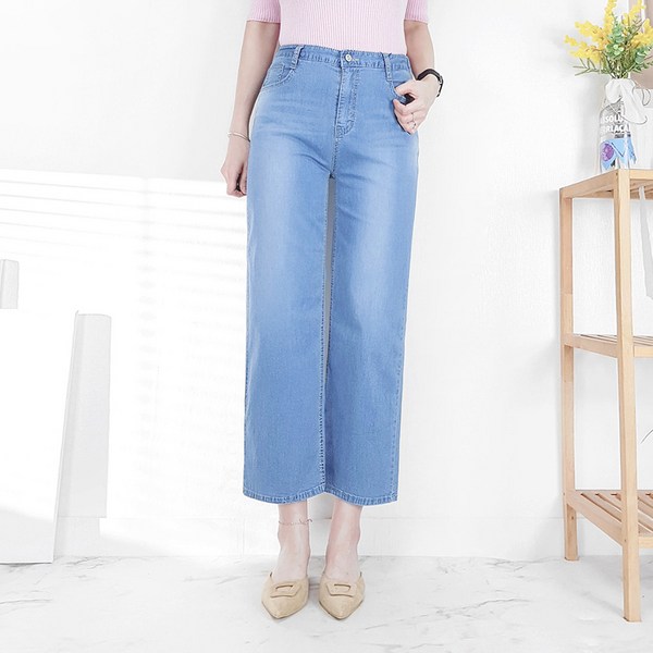 27번: 103st 기능성 쿨원단 하이웨스트 연청 와이드 데님 팬츠 9부/여성 밴딩 스판 통청바지 S~3XL 빅사이즈