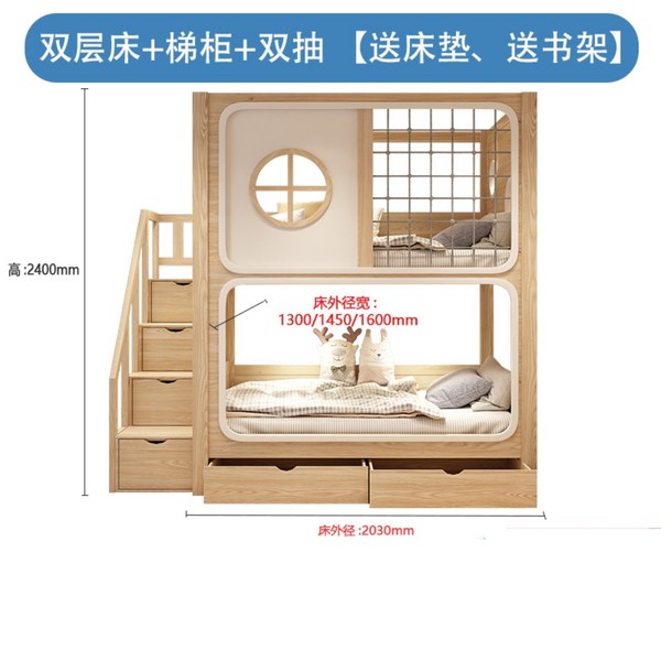 18번: 원룸 벙커침대 어른 성인 원목 2층침대 계단형 퀸사이즈 기숙사 이층침대, 상단 너비 140 하단 너비 160 – 그런 다음 베, 사다리장 + 전기드릴 + 매트리스 + 책장 + 서랍