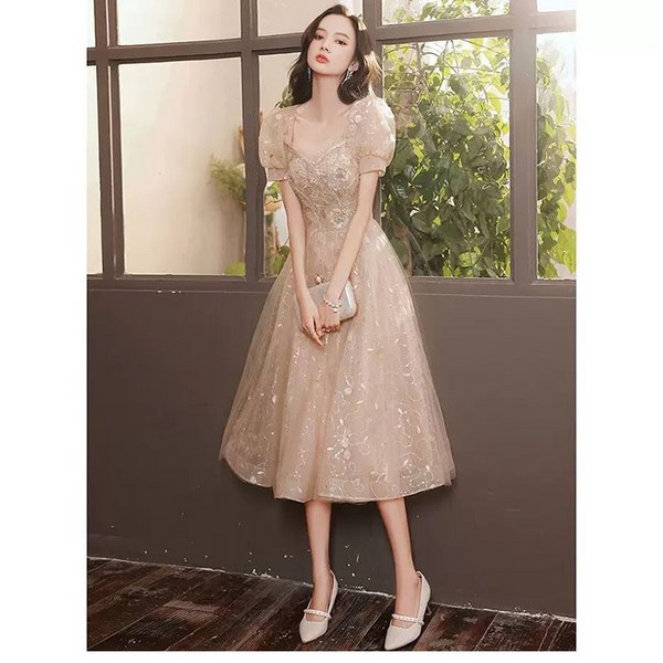 4번: FANSYLI 파티 이브닝 드레스 여성 패션 스퀘어넥 버블 소매 드레스 스커트 고급감 프랑스식 스팽글 드레스 스커트 중장형 공연 드레스 스커트 사회자 드레스 스커트 단체 드