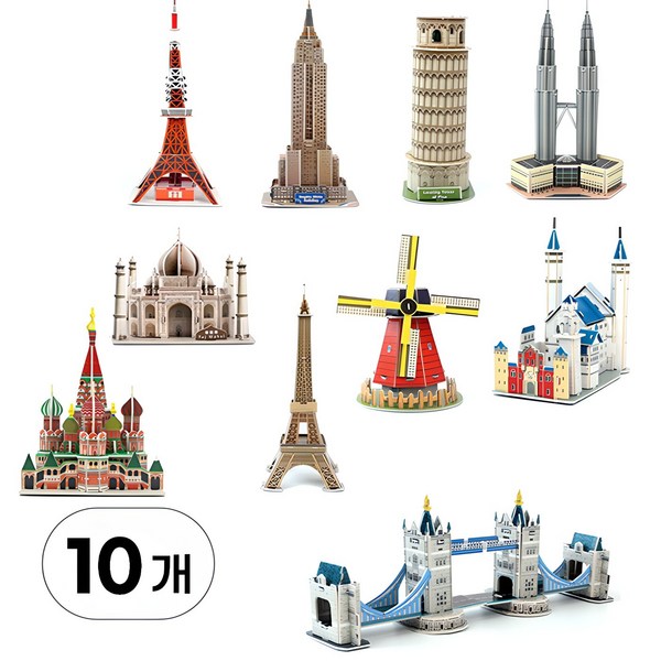 2번: 투데이토이 10종 세트 3D 입체 퍼즐 랜드마크 DIY 만들기 조립 키트 세계 건축물 모형 장난감, W99036A(랜드마크 10종 혼합색상, 1세트, 245피스