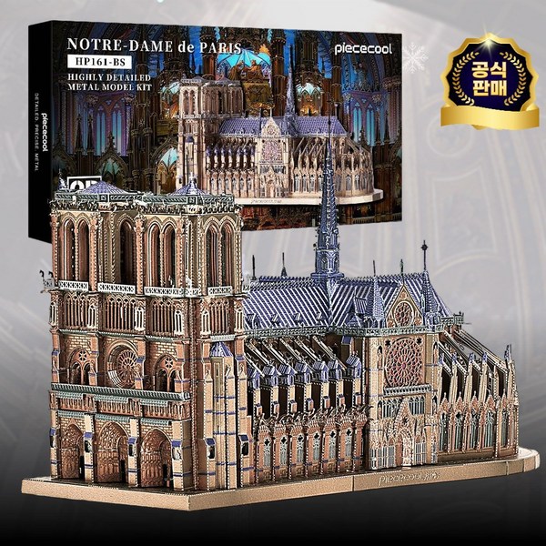 27번: 피스쿨 3D 메탈 퍼즐 노트르담 대성당 파리 랜드마크 모형 DIY 조립 키트, 1개, 382피스, 골드블루