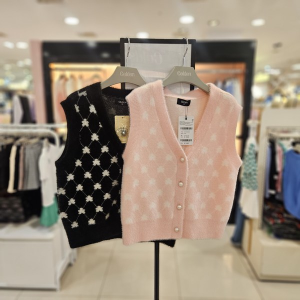 17번: 셀덴 [동아백화점 수성점] 60% 겨울시즌 여아 아동 키즈 부드러운 극세사 플라워 아가일 무늬 진주 단추 루즈핏 자가드 오픈형 브이넥 조끼 EDVK23W05-01