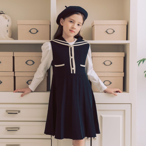 18번: 셀덴 [동아백화점 수성점] 23년겨울 여아 스트라이프 배색 반오픈 세일러 카라 민소매 라인 니트 원피스EDOK23T01-01