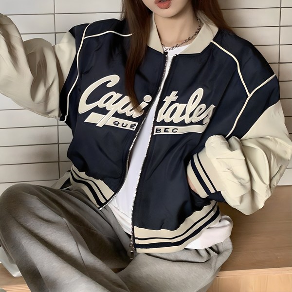 21번: 네모엔룩 여성용 바이브 심플 레터링 로고 자수 바시티 자켓 스냅 버튼 시보리 안감 라인 배색 야구 점퍼 NL