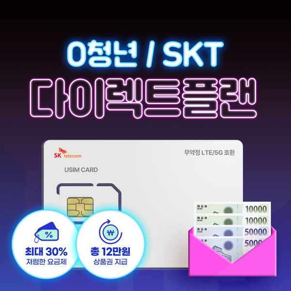 14번: SKT 다이렉트플랜 / 0청년 다이렉트플랜 / 유심 / USIM / 알뜰폰 알뜰요금제 / 12만상품권지급, 1GB, 번호이동&알뜰폰,요금제(다이렉트34요금제부터가능)