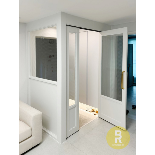 27번: [03] 바른도어 ㄱ자 파티션 비대칭양개스윙 중문 슬라이딩 화이트 투명망입[부식]강화 시공비포함 현관 중문 아파트 빌라 반려견 소음차단, 1개