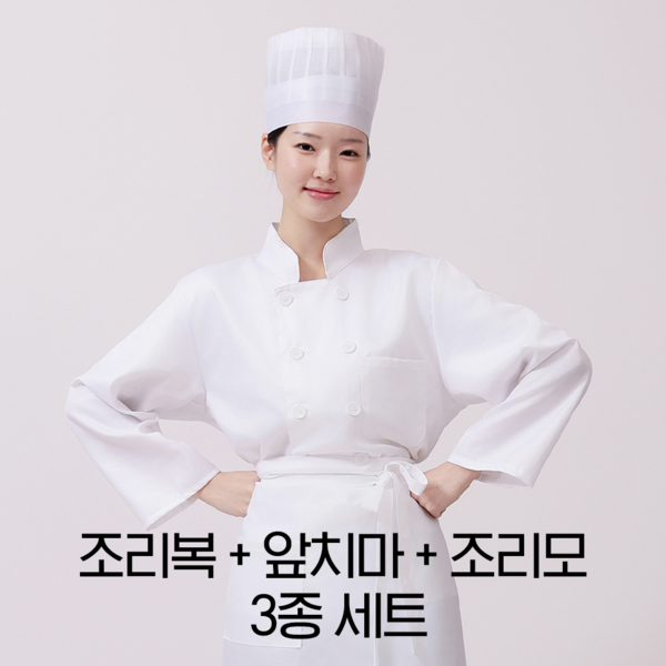 20번: 조리 기능사 시험용 조리복 세트 3종 (긴팔 모자 앞치마) 한식 중식 양식 제과제빵