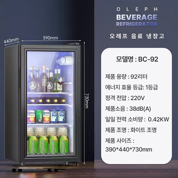 5번: 오레프 저소음 음료수 냉장고 가정용 LED 술장고 미니 소형 술 쇼케이스 업소용 소주, 92리터 블랙
