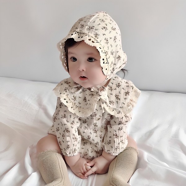 29번: [당일발송] 아기 신생아 여아 레이스 카라 잔꽃 바디슈트 보넷 모자 세트 외출복