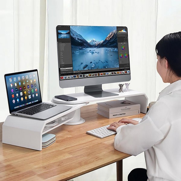 29번: 몽상컴퍼니 DM-95 2단 와이드 모니터 받침대 사무실 서재 데스크테리어 13.5 높은 듀얼 받침 오픈형 선반 가로길이 950mm, 화이트
