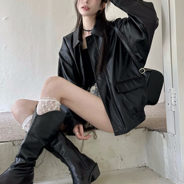 18번: 여성 PU 가죽 자켓 캐주얼 봄 가을 상의 아우터 루즈핏 코트 기질 라이더 자켓 빈티지 터틀넥 PU 가죽 재킷 CY